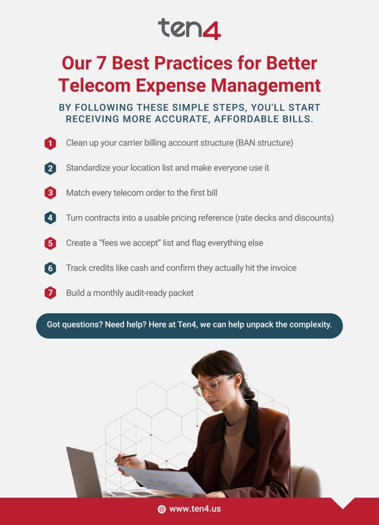 - Log it the second the dispute is opened (carrier, Billing Account Number, location, what’s wrong, dollars, date, case number) in one shared tracker like a spreadsheet or TEM